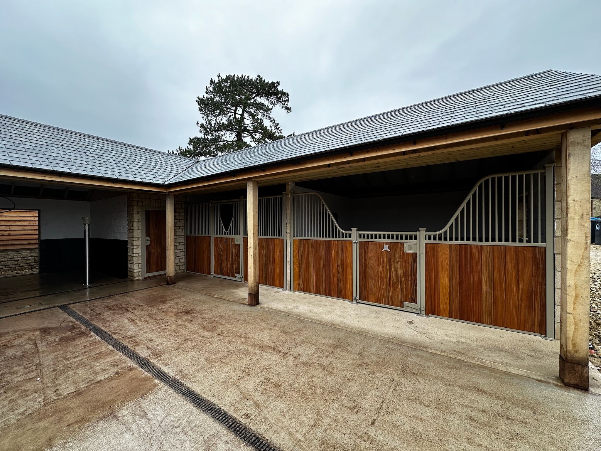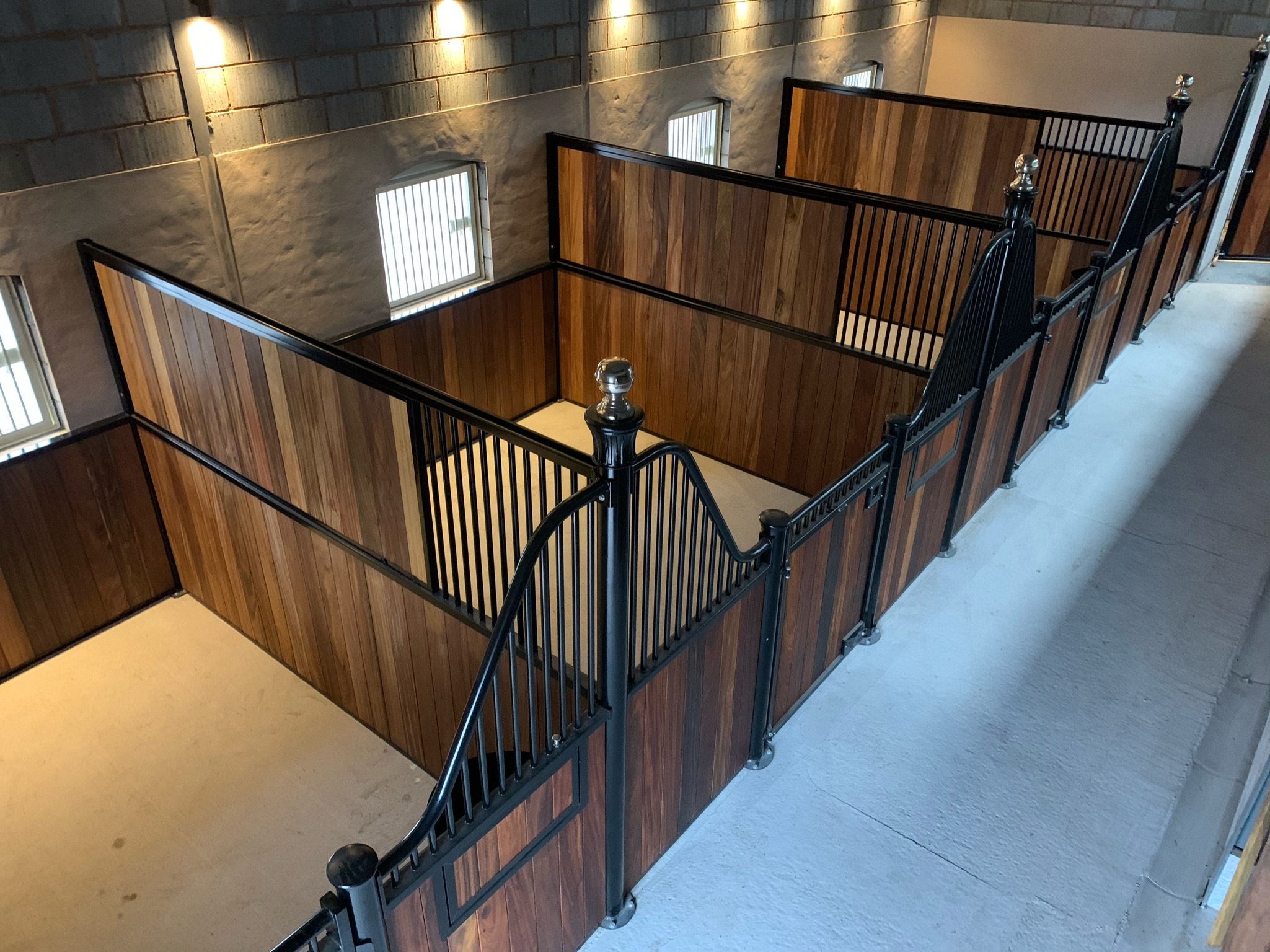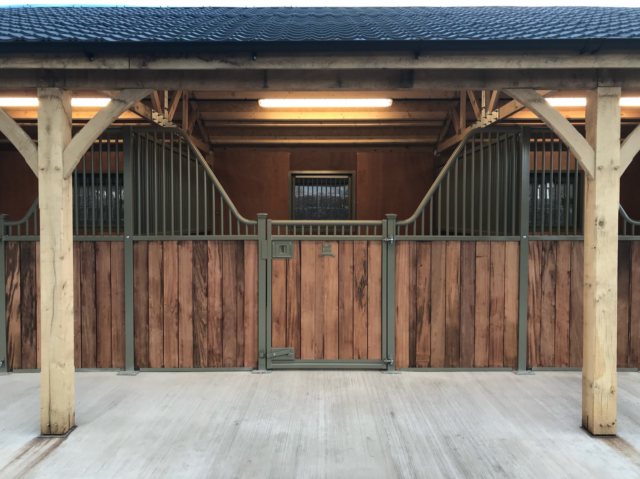 Modern internal stable design with clean, linear square post profiles.