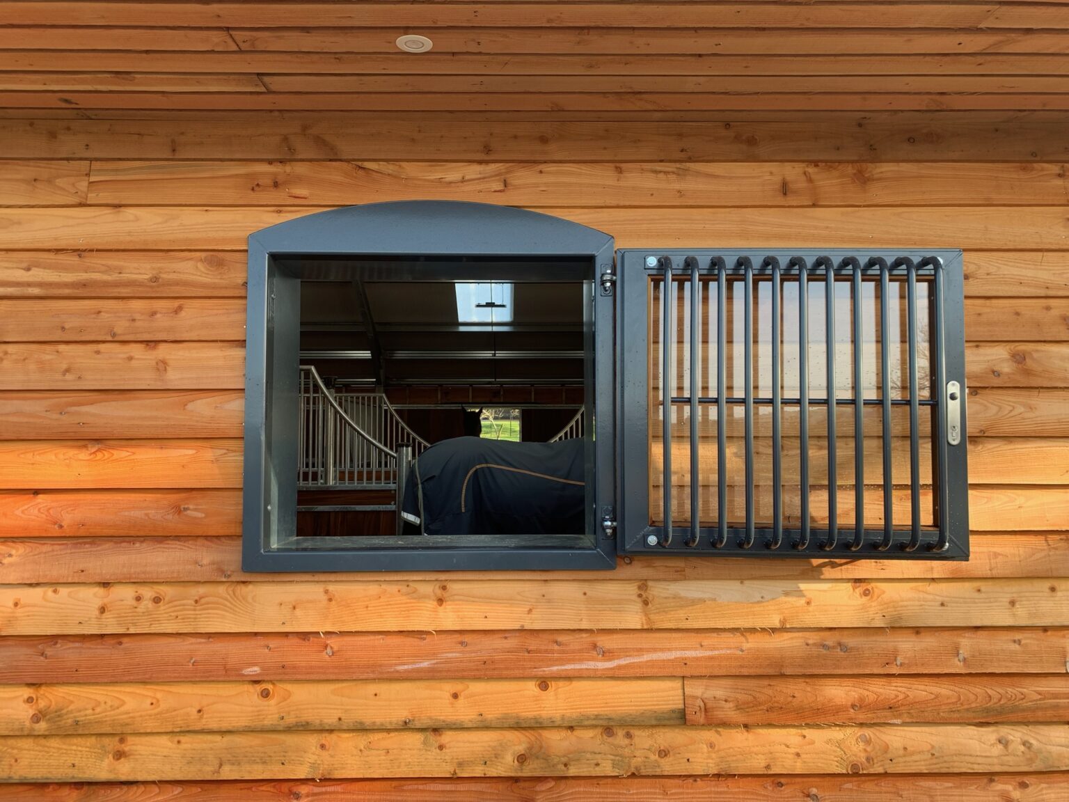 Our steel-framed hinged windows with laminated glass provide an abundance of natural light, even when closed. Designed with a removable internal grille, they offer protection for both the glass and your horse. To enhance security, we fit a fully lockable sash lock with stainless steel cover plates on both the inside and outside, giving the window a finished, polished look. These windows are hung off an angled frame for smooth operation and come with a tie-back for when in use. Powder coating is also available to soften the look and help blend in with outbuildings.